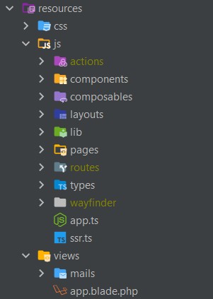 Vu que nous utilisons un starter kit, certaines pages sont déjà présentes, comme toute la gestion de l'authentification (login, register, lostpassword) et la gestion de son profil. Ces pages sont regroupées dans le dossier resources/js