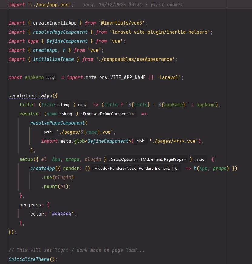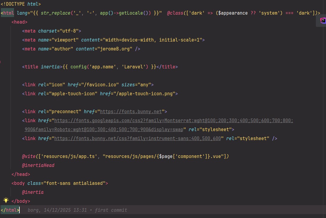 Une fois que notre application sera "buildée", elle sera automatiquent "bindée" dans le fichier resources/views/app.blade.php grâce aux directives blade, @inertiaHead et @inertia, ainsi inertia fait le lien entre le front et le back.